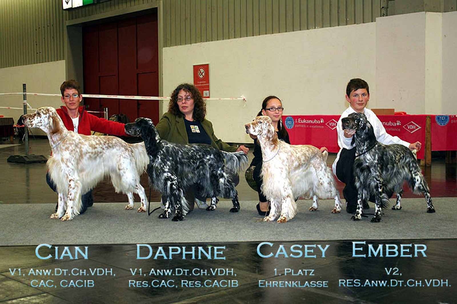 | 07.05.2011 - FCI-Jahrhundertsieger-Ausstellung Dortmund - LJS Famous Fred On Fire Fred von der Guldegg (JuKl): SG4 Slov.Ch., Dt.Jug.Ch.(VDH), ÖJCH, VDH-EJS, LS, LJS Elitiste Mr Rodney Rodney von der Guldegg (ChKl): V4 C.I.E. ÖCH Dt.Ch.VDH SkCh ÖJUCH SkJCh BS '10 Dt.BS '08, Austrian Show Winner 10 You Win My Heart Casey von der Guldegg (ChKl): V2, Res.Anw.Dt.Ch.(VDH), Res.CAC, Res.CACIB, FCI-VIZE-JAHRHUNDERTSIEGER ÖCH, Dt.Ch.(VDH), ÖJCH, BS '09, Middle East European Winner '09, ÖKV Centennial Winner, Austrian Show Winner 09 Duchess Diamond Heart Ember von der Guldegg (OKl): V2, Res.Anw.Dt.Ch.(VDH) |