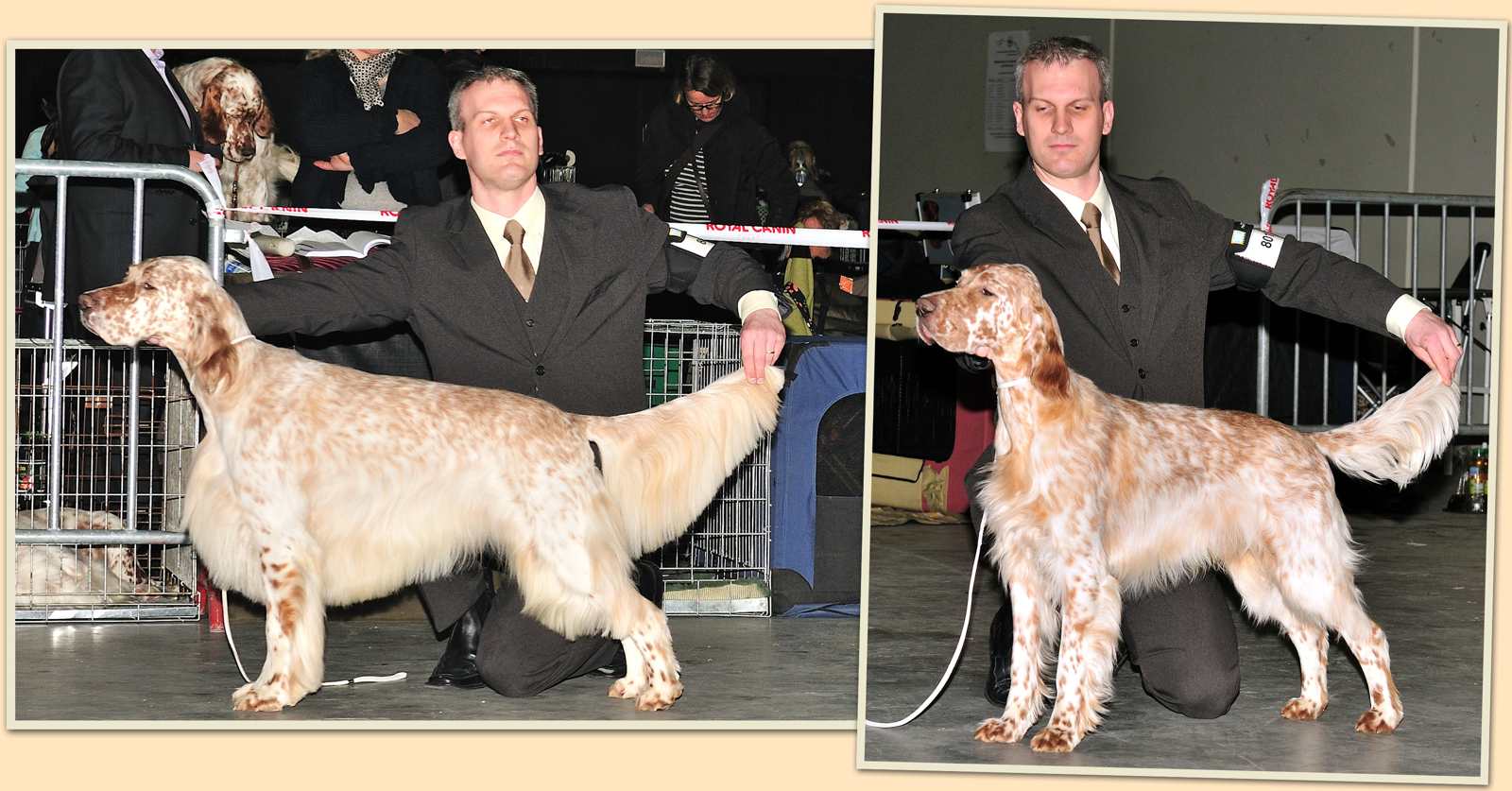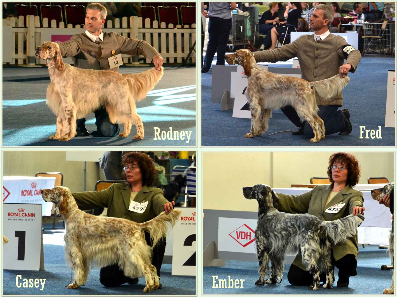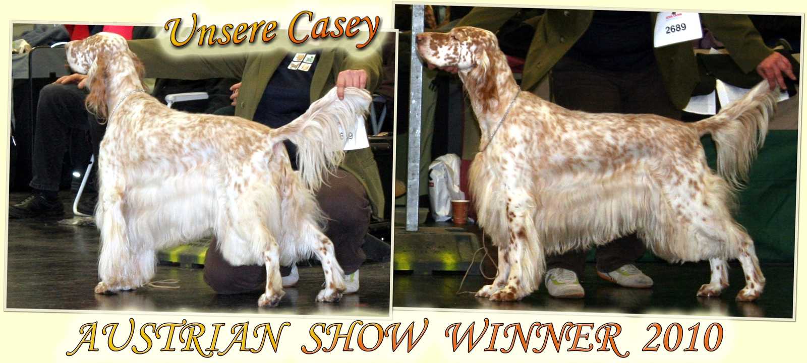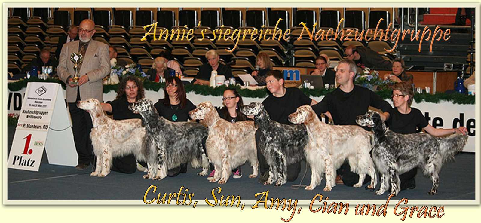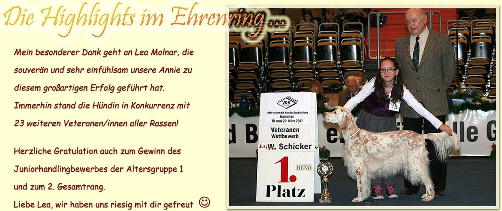 | 03.10.2011 CAC Forst - Ein wunderbarer Tag mit lieben Freunden ging viel zu rasch vorbei ... nicht weniger als 12 Setter aus 9 Würfen oder 4 Generationen der Guldegg-Family zwischen 14 Jahren und 15 Wochen gaben sich ein kurzes Stelldichein, ... das absolute Highlight des Tages lieferte aber wieder Rodney ... er wurde, wie auch schon im Vorjahr, BEST IN SHOW !!! Ein herzliches Dankeschön auch für die gelungene nachträgliche Überraschungs-Geburtstagsfeier :-)) Dt.Jug.Ch.(VDH), ÖJCH, VDH-EJS '11, LJS Famous Fred On Fire Fred von der Guldegg (ZwKl): V1, Anw.Dt.Ch.(VDH), Res.CAC VDH-ES '11, Dt.Ch.(VDH), Slov.Ch., Dt.Jug.Ch.(VDH), ÖJCH, VDH-EJS, LS, LJS Elitiste Mr Rodney Rodney von der Guldegg (ChKl): V1, Anw.Dt.Ch.(VDH), CAC, SIEGER BADEN, BOB, BEST IN SHOW C.I.E. ÖCH Dt.Ch.VDH SkCh ÖJUCH SkJCh BS '10 Dt.BS '08, Austrian Show Winner 10 You Win My Heart Casey von der Guldegg (EhKl): 1. Platz C.I.E. Dt.Ch.(VDH) ÖCH SkCh SkGrandCh ÖJUCH SkJCh "U" Cross My Heart Joanne Annie von der Guldegg (VeKl): 1. Platz, Anw.Dt.Vet.Ch.(VDH), BEST VETERAN IN SHOW C.I.E. ÖVetCh., ÖCH, Dt.Ch.(VDH), Sk.Ch., ÖJCH, FCI-EJS Qu's Gonna Wonna Win Winnie von der Guldegg (VeKl): 2. Platz, Res.Anw.Dt.Vet.Ch.(VDH) ÖCH, Dt.Ch.(VDH), ÖJCH, BS '09, Middle East European Winner '09, ÖKV Centennial Winner, Austrian Show Winner 09 Duchess Diamond Heart Ember von der Guldegg (ChKl): V1, Anw.Dt.Ch.(VDH), CAC, SIEGER BADEN Fay Legend In Tri Fay von der Guldegg (OKl): V1, Anw.Dt.Ch.(VDH), Res.CAC Genesis Rebecca Rebecca von der Guldegg (BabyKl): 1. Platz, BEST BABY IN SHOW Mehr Bilder gibt es HIER | |