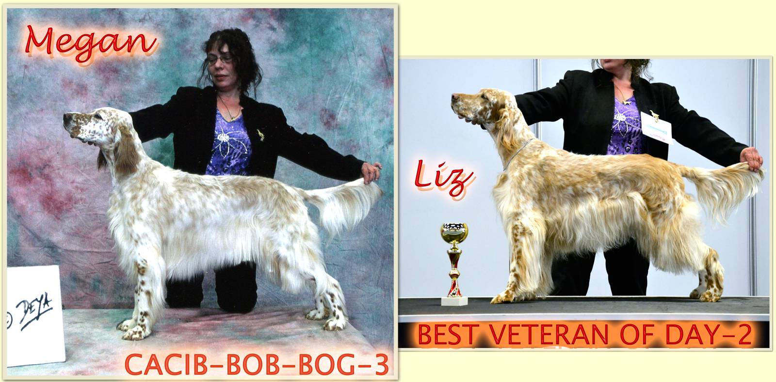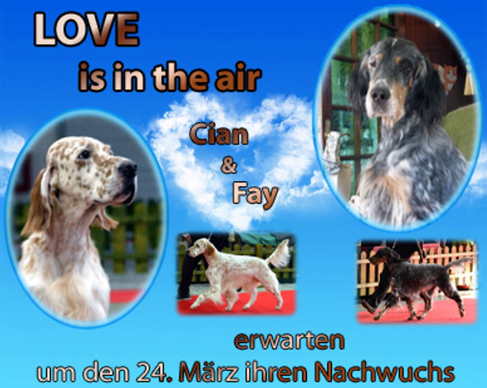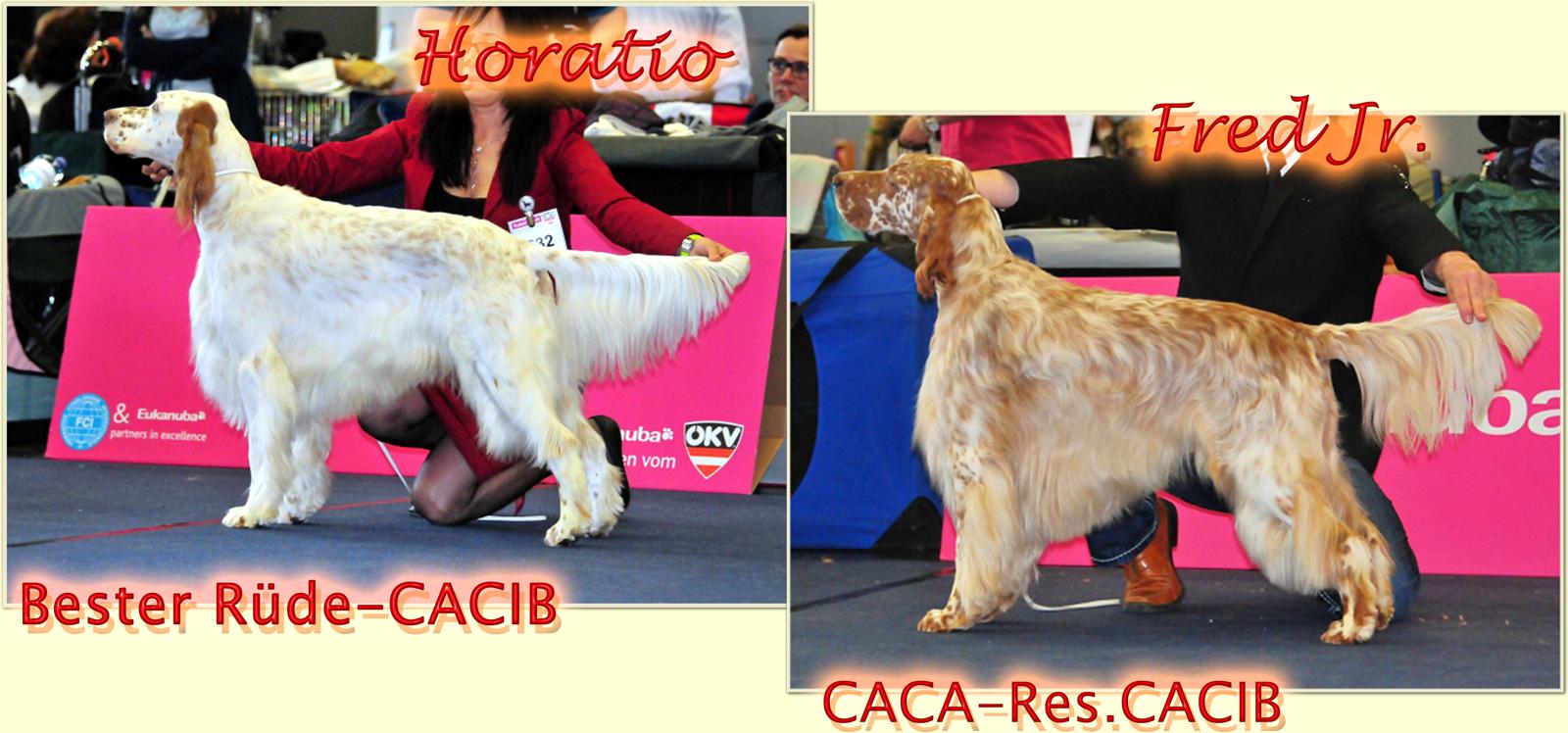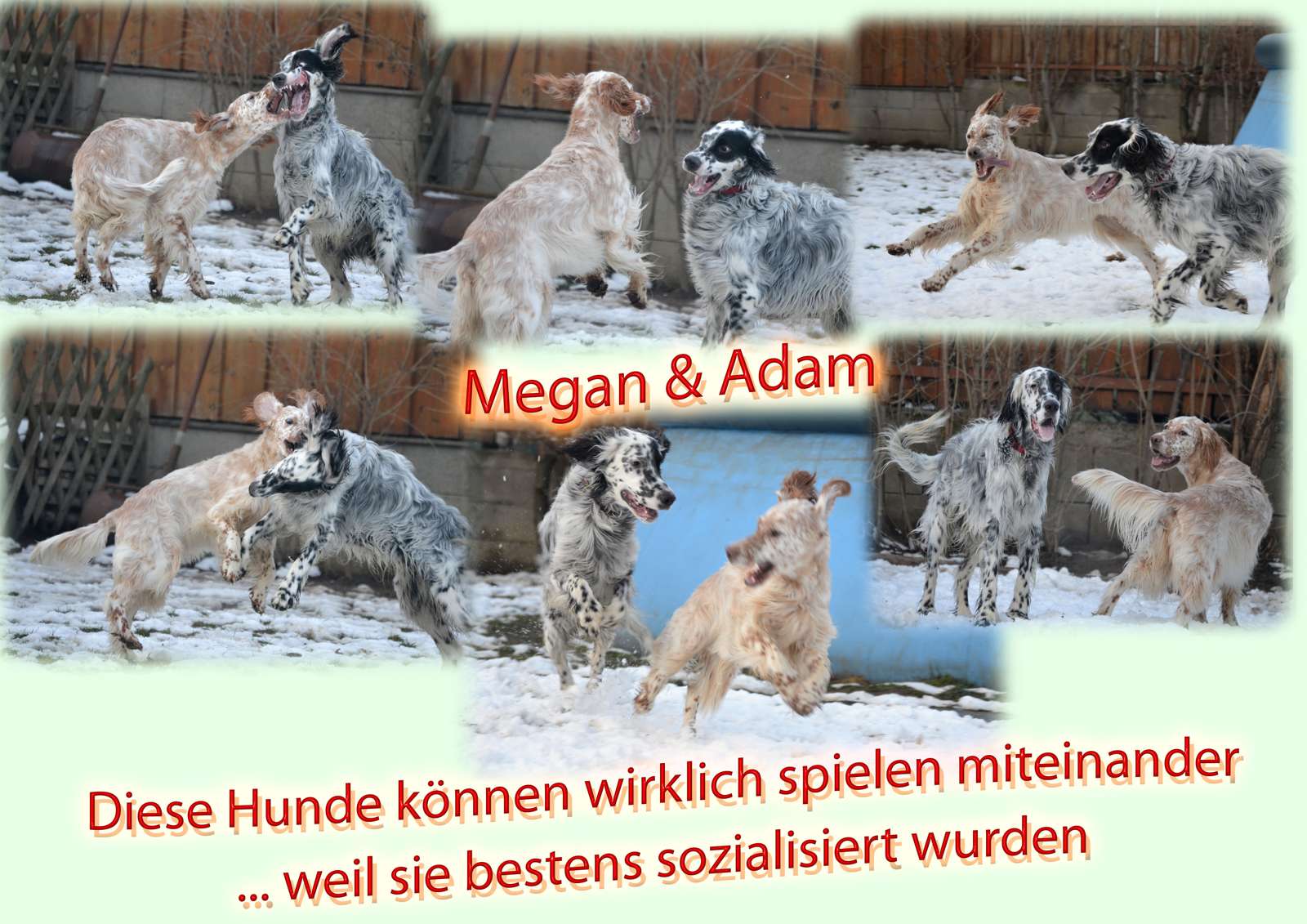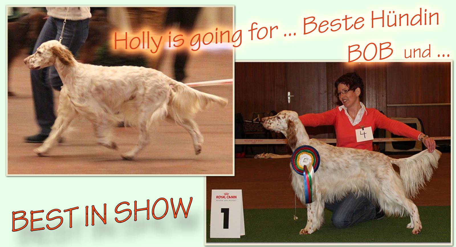 | 02.03.2013 CACIB Graz - Unsere beiden Guldegg-Mädchen schlagen sich gegen weitaus ältere Konkurrenz sehr wacker ... VDH-EJS '12, Lux.Jun.Ch., ÖJCH, Dt.Jug.Ch.(VDH), SkJCh, BJS Heather HoneyMoon Megan von der Guldegg (ZwKl): V1, CACA, Res.CACIB Gillian Leigh Anderson Gladys von der Guldegg (OKl): V2, Res.CACA Besonders freuen wir uns über das Showdebüt vom Cian-Grace-Enkel Running To Stand Still Open Minded Adam Clayton. Aus der Jugendklasse gewinnt er V1, JUGENDBESTER und J-BOG-3 ! Wir gratulieren Johanna ganz herzlich, die sich als Show-Neuling in dieser Szene überzeugend mit diesem Top-Junghund beweisen konnte! Da wir unsere Besucher nicht nur mit Ausstellungsfotos langweilen wollen, nachfolgend eine kleine Collage von Adam und unserer Megan ... kurz bevor er seinen Super-Wellness-Termin mit unserer genialen Groomerin Krisztina im Münchendorfer Setterhaus wahrgenommen hat ... Danke Lea für die tollen Aufnahmen! | |