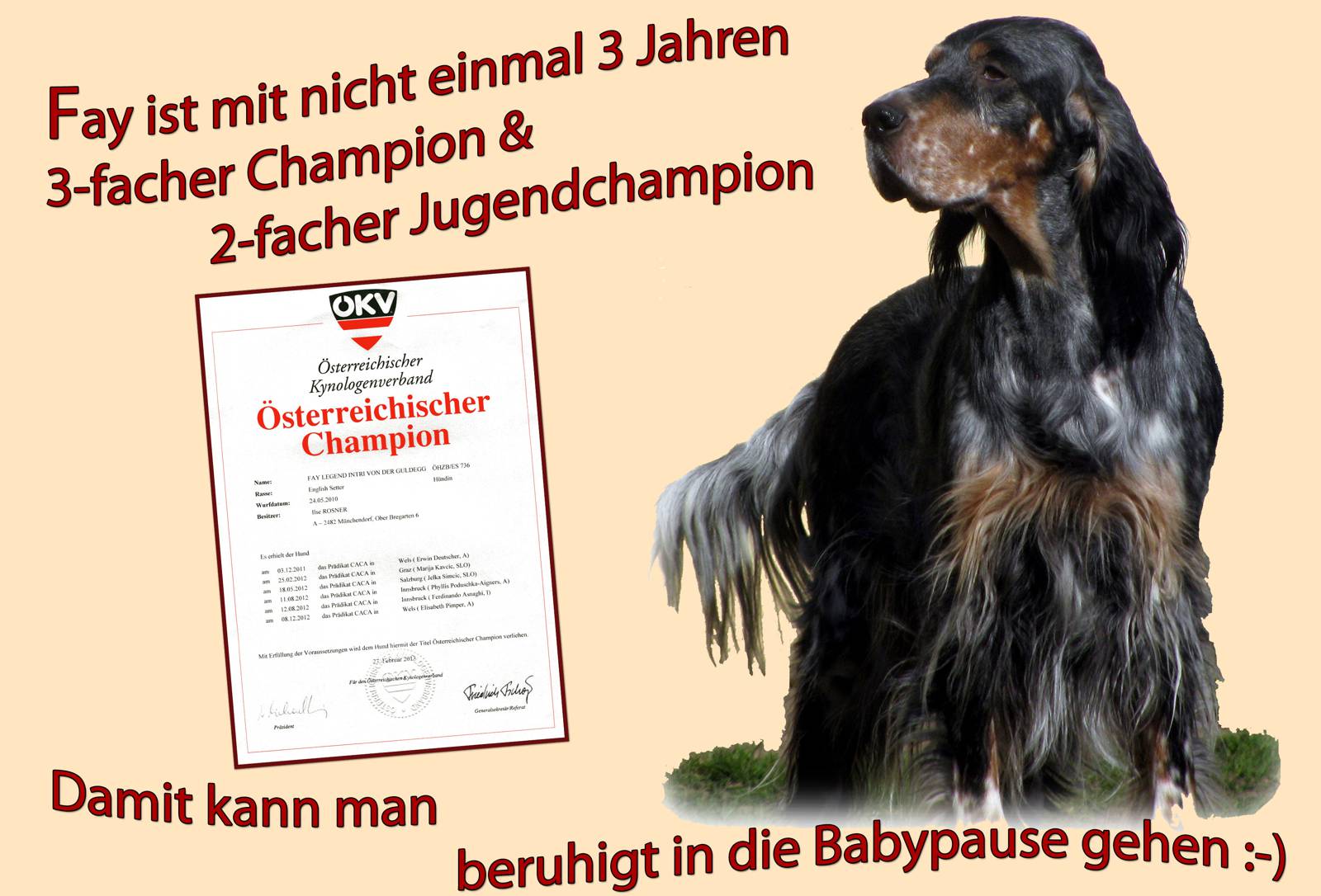 | 01.03.2013 Heute haben wir ganz unerwartete Post vom ÖKV erhalten! Unserer werdenden Mama Fay wurde der Titel ÖSTERREICHISCHER CHAMPION zuerkannt ... wir sind sehr stolz auf unsere junge Tricodame. | |