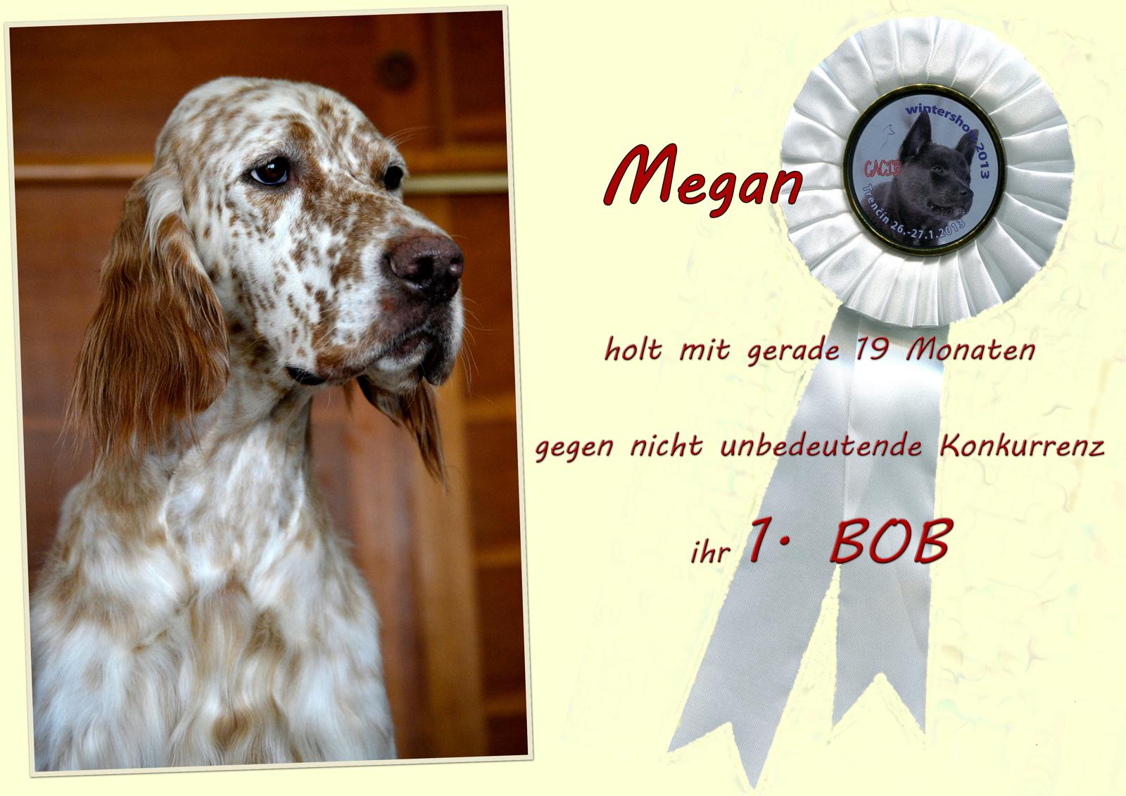 | 27.01.2013 CACIB Trencin - Unsere Junghündin Megan beeindruckt den Richter mit ihren Showqualitäten und kann sich damit nicht nur über ein weiteres CACIB sondern auch über ihr erstes BOB freuen. Wir sind sehr stolz auf diese wunderbare Cian-Liz-Tochter, die ihrer Großmutter Romy immer ähnlicher wird! VDH-EJS '12, Lux.Jun.Ch., ÖJCH, Dt.Jug.Ch.(VDH), SkJCh, BJS Heather HoneyMoon Megan von der Guldegg (ZwKl): V1, CAC, CACIB, BOB Dt.Ch.(VDH), ÖJCH, Jug.Ch.HR Fay Legend In Tri Fay von der Guldegg (OKl): V1, CAC ... und damit auch SLOWAKISCHER SCHÖNHEITS-CHAMPION | |