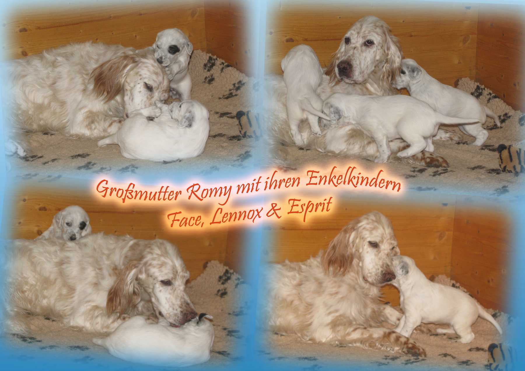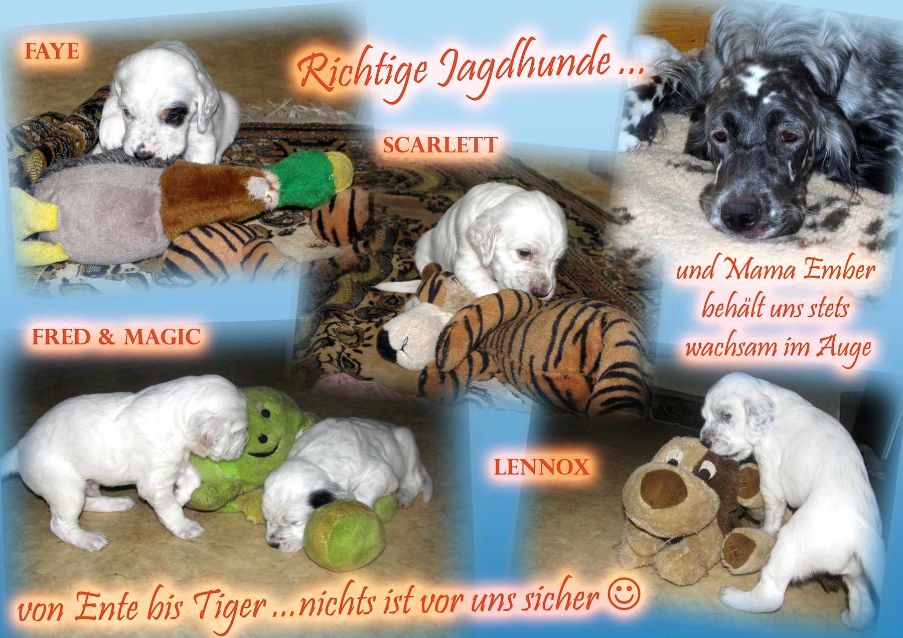 Die 8-köpfige kleine Mannschaft entwickelt sich prächtig und jeder für sich beginnt bereits individuelle Wesenszüge zu zeigen. Ember ist eine wunderbare Mutterhündin, die alles bestens im Griff hat und sich auf die Mitarbeit der restlichen Gang vollauf verlassen kann. Wir sind sehr glücklich, dass unser junger Rüde Marvin unverkennbar in die Fußstapfen unseres unvergessenen Old-Boy Frosty tritt. Seine instinktsichere und behutsame Art mit den Welpen umzugehen begeistert uns jeden Tag von Neuem. Hoffentlich tritt die angekündigte Wetterbesserung doch einmal ein, damit das Betätigungsfeld der 8 Kids For Fun nach draußen in die Welpenanlage verlegt werden kann ... |