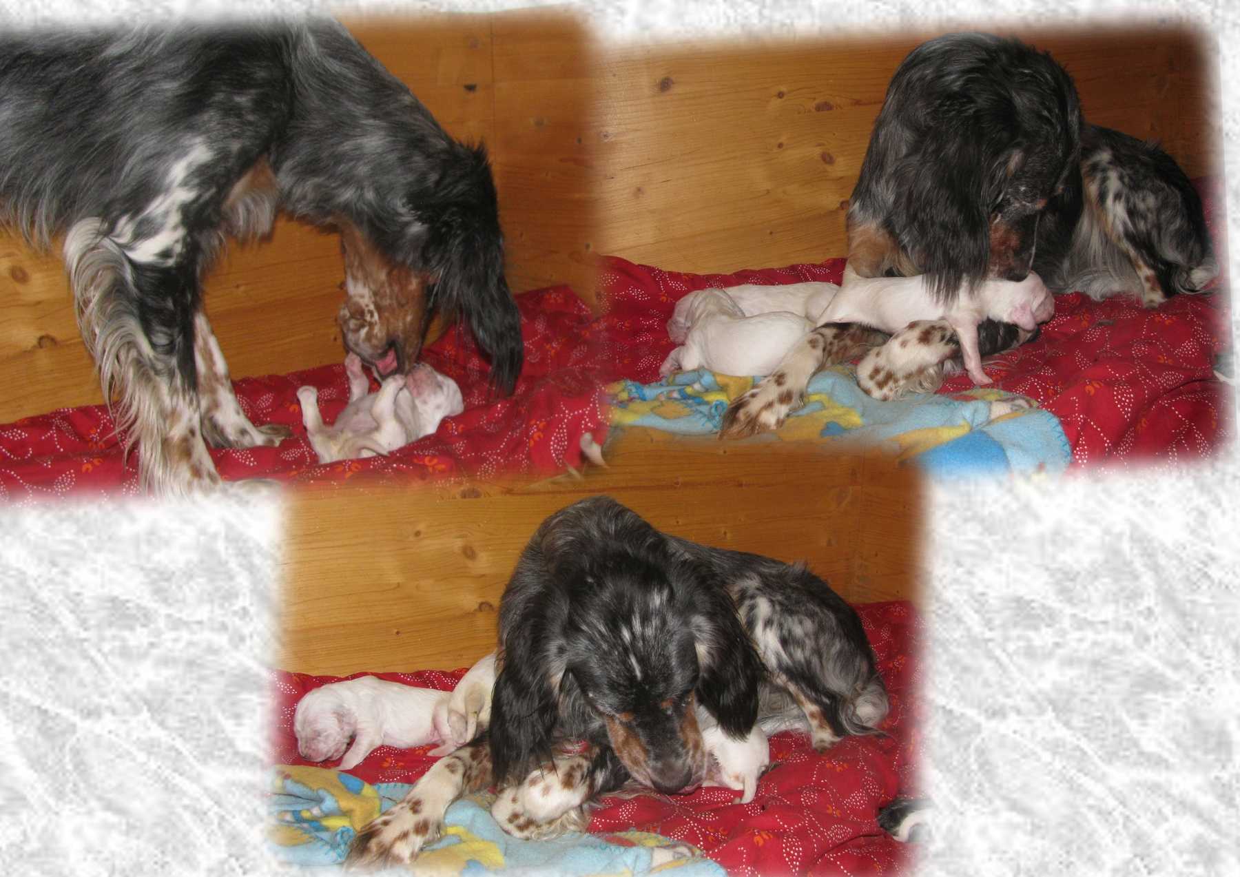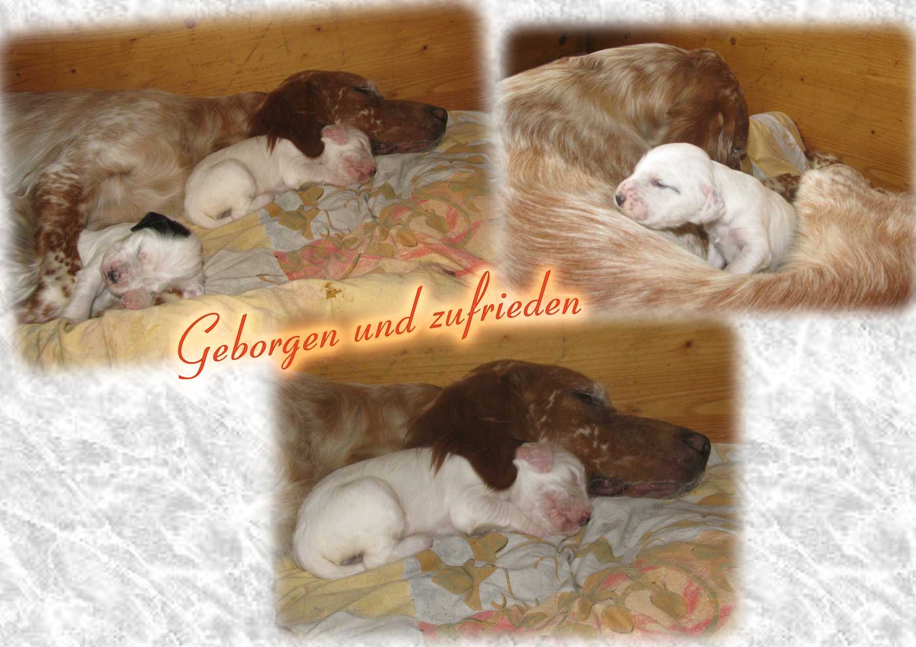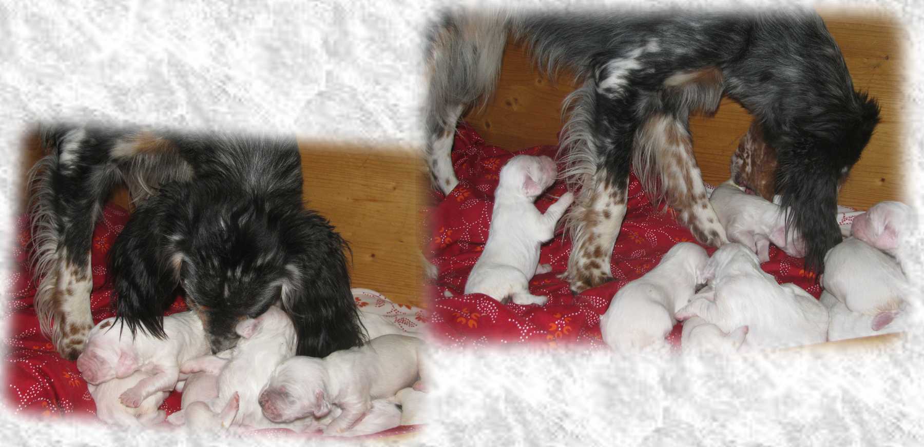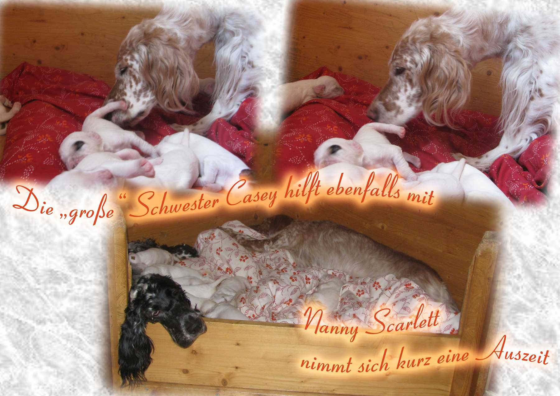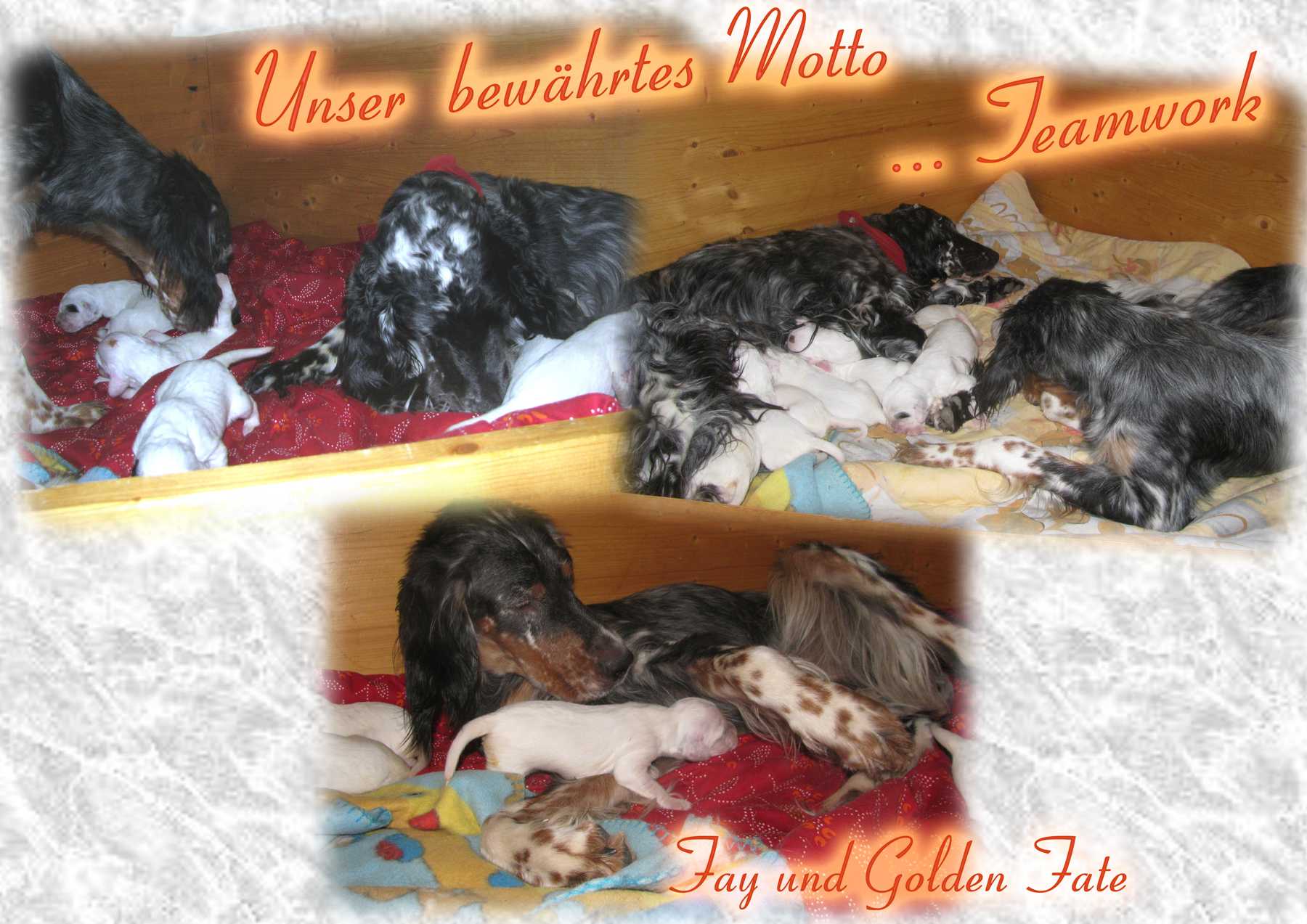 Daphne meistert ihre Mutterrolle mit viel Einfühlungsvermögen und unglaublicher Routine. Die Kleinen entwickeln sich prächtig und nicht nur am Farbsektor dürfte die Gang of Glory künftig einiges zu bieten haben. Grand Slam Jimbo und Great Gatsby sind tricolor, Gentle Heartbreaker blue belton und bei den Glamour Girls sind alle drei Farben vertreten, wobei hier Orange belton in der Überzahl ist. Aber zum jetzigen Zeitpunkt wollen die sieben Hündinnen dieses Geheimnis noch nicht wirklich lüften. Auf jeden Fall freuen wir uns riesig über diese Farbenvielfalt! |