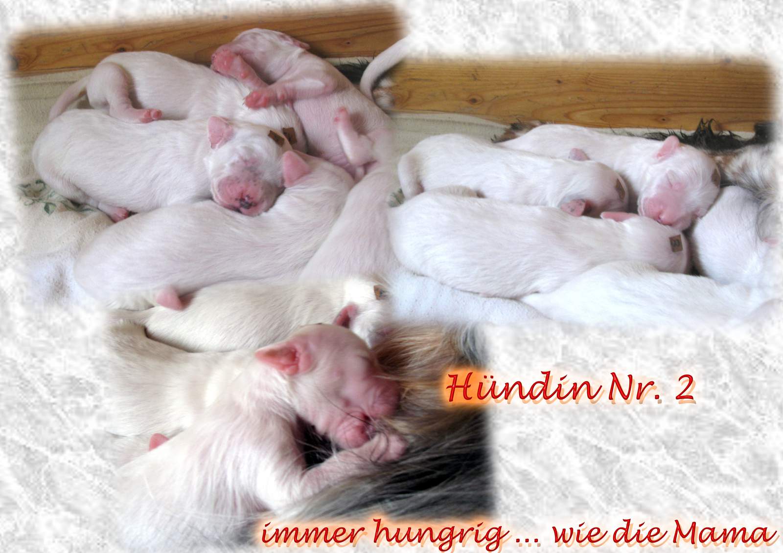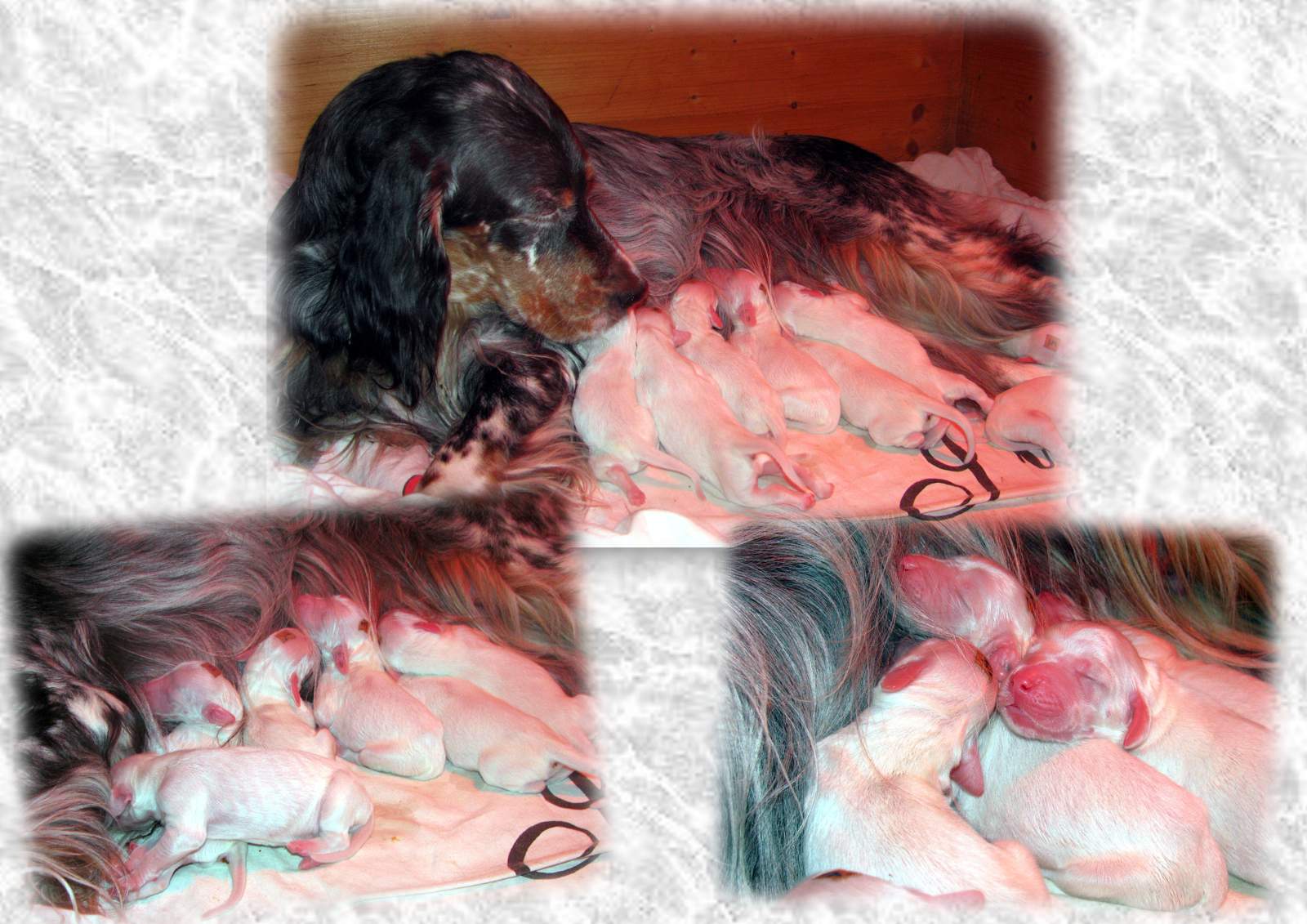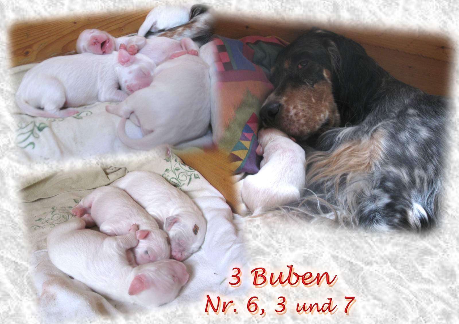 | nach: ÖCH, Dt.Ch.(VDH), ÖJCH, BJS, LS, BOB Cheek by Jowl Cian von der Guldegg, HD-A1, ED-frei (0/0), OCD-Schultergelenk frei, OCD-Ellbogengelenk frei, beidseitig hörend (BAER normal) |