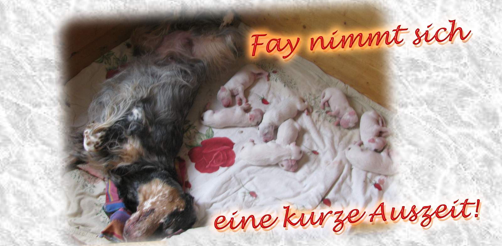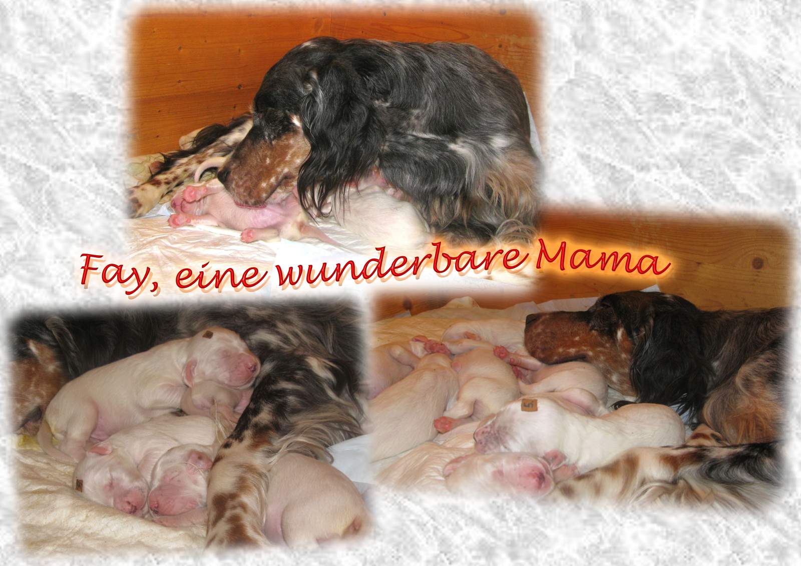 | aus: ÖCH, Dt.Ch.(VDH), SkCh, ÖJCH, Kroat.Jug.Ch. Fay Legend In Tri Fay von der Guldegg, HD-A1, ED-frei (0/0), OCD-Schultergelenk frei, OCD-Ellbogengelenk frei, beidseitig hörend (BAER normal) |